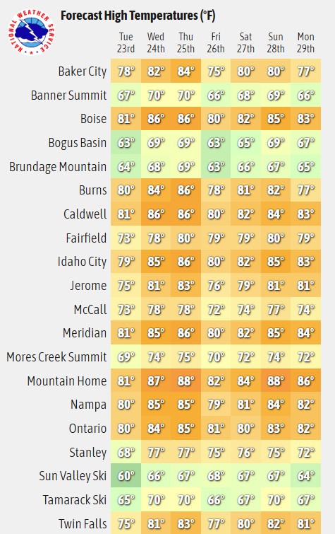 Idaho expects sunny, warm weather with peak temperatures midweek and weekend.