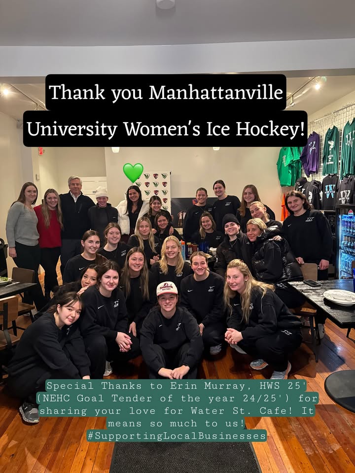 Water St. Cafe in Geneva, NY recently welcomed back alumni who returned not only to visit but also to compete, bringing the entire team with them. The establishment prepared meals for the visiting Valiants women's ice hockey team, representing Manhattanville University. Erin Murray, the HWS 25' who was named NEHC Goaltender of the Year for the 2024/2025 season, expressed her appreciation for the local small business and its role in supporting local community sports. The event highlighted the strong relationship between the local business community and sports teams in upstate New York.